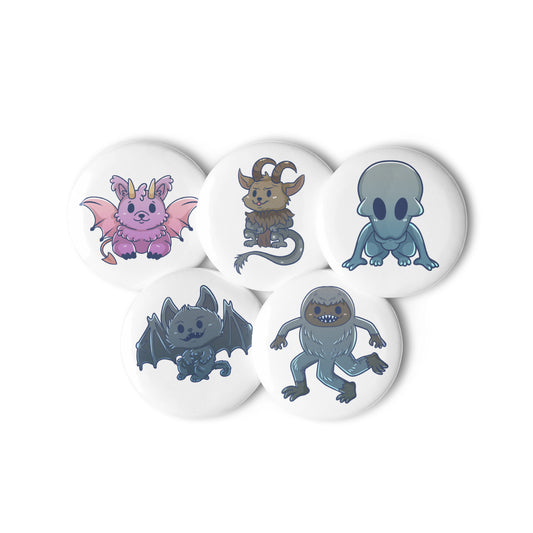 Adorable Cryptids 5ct Variety Set of Pin Buttons - Enfield Horror, Dover Demon, Goatman, Jersey Devil, Batsquatch