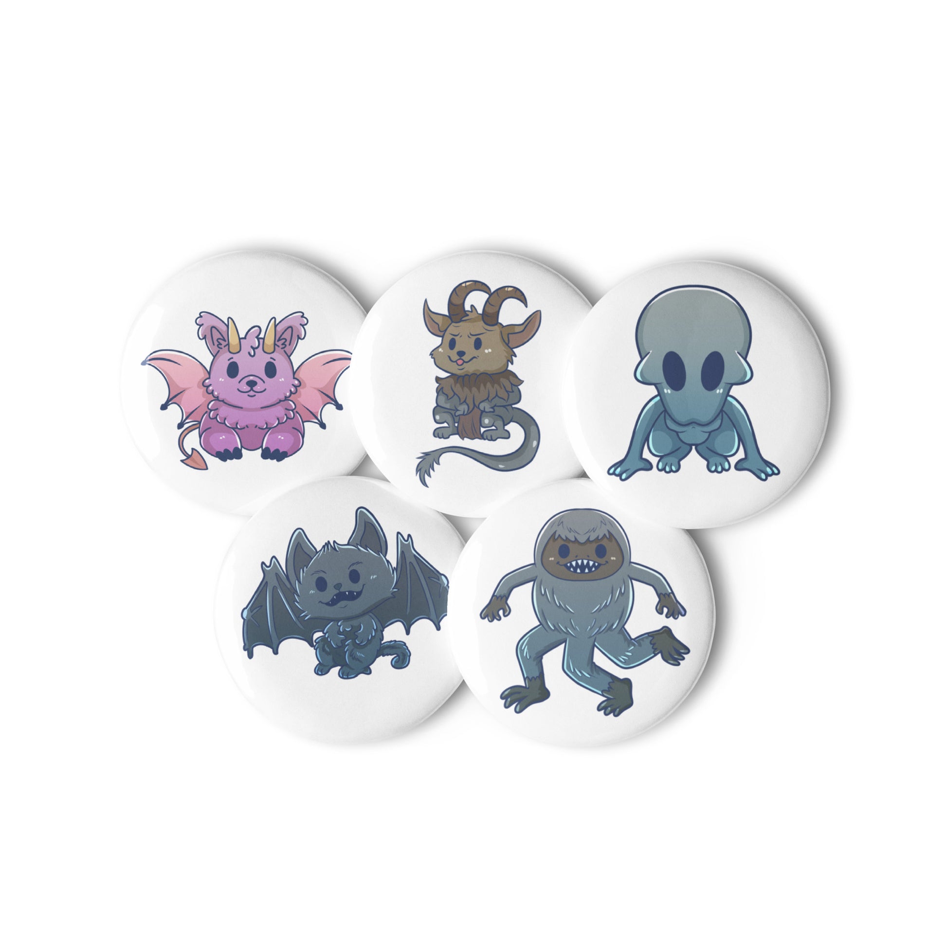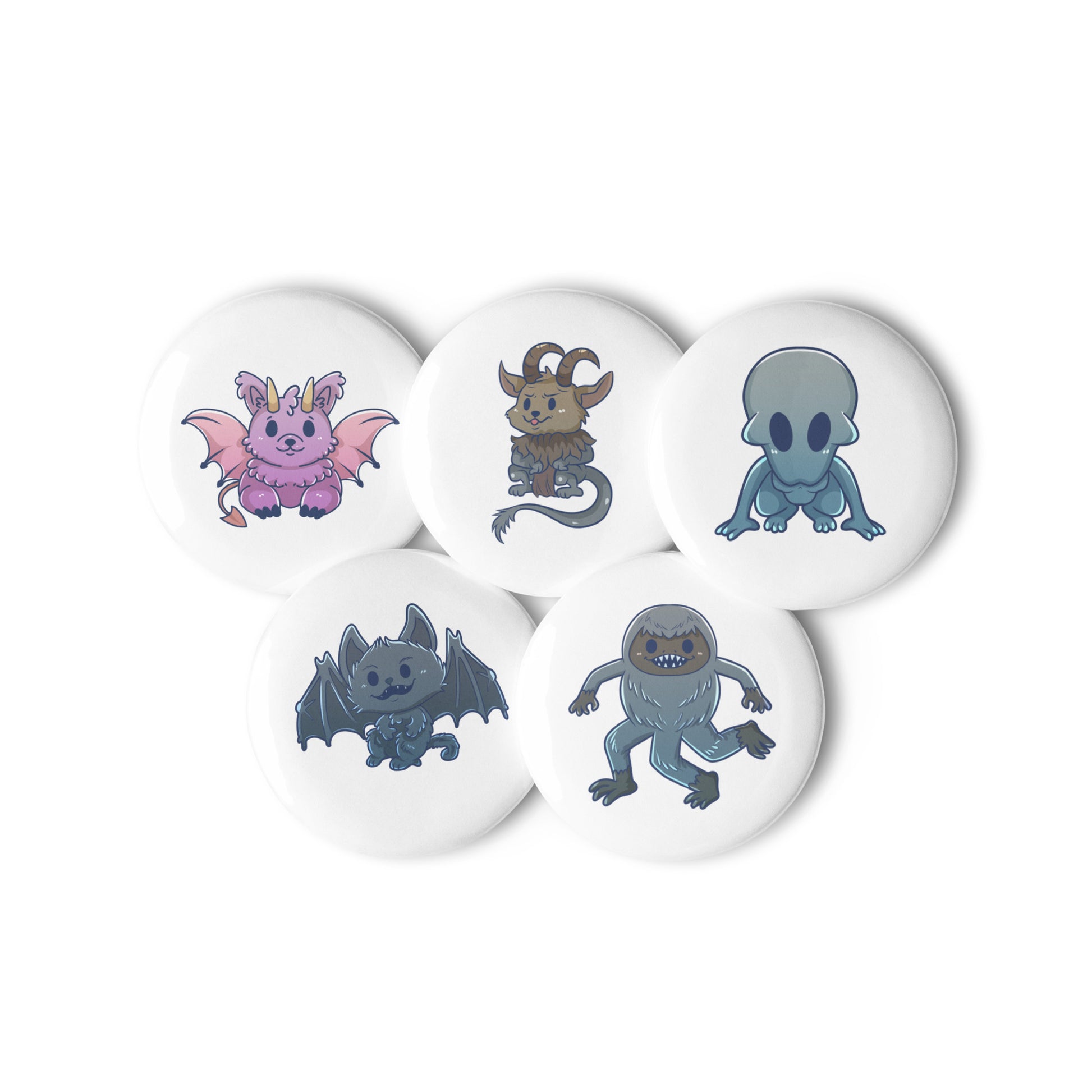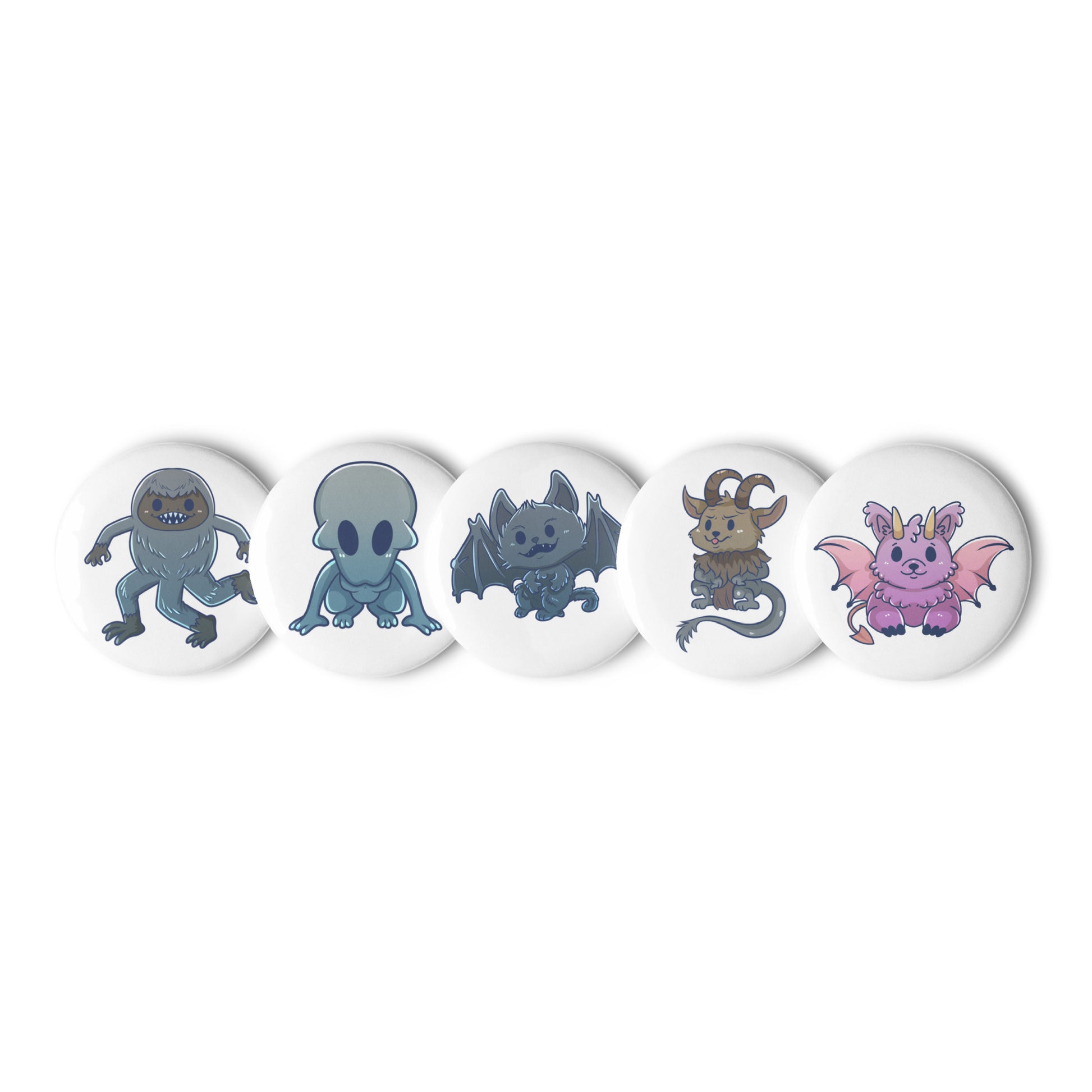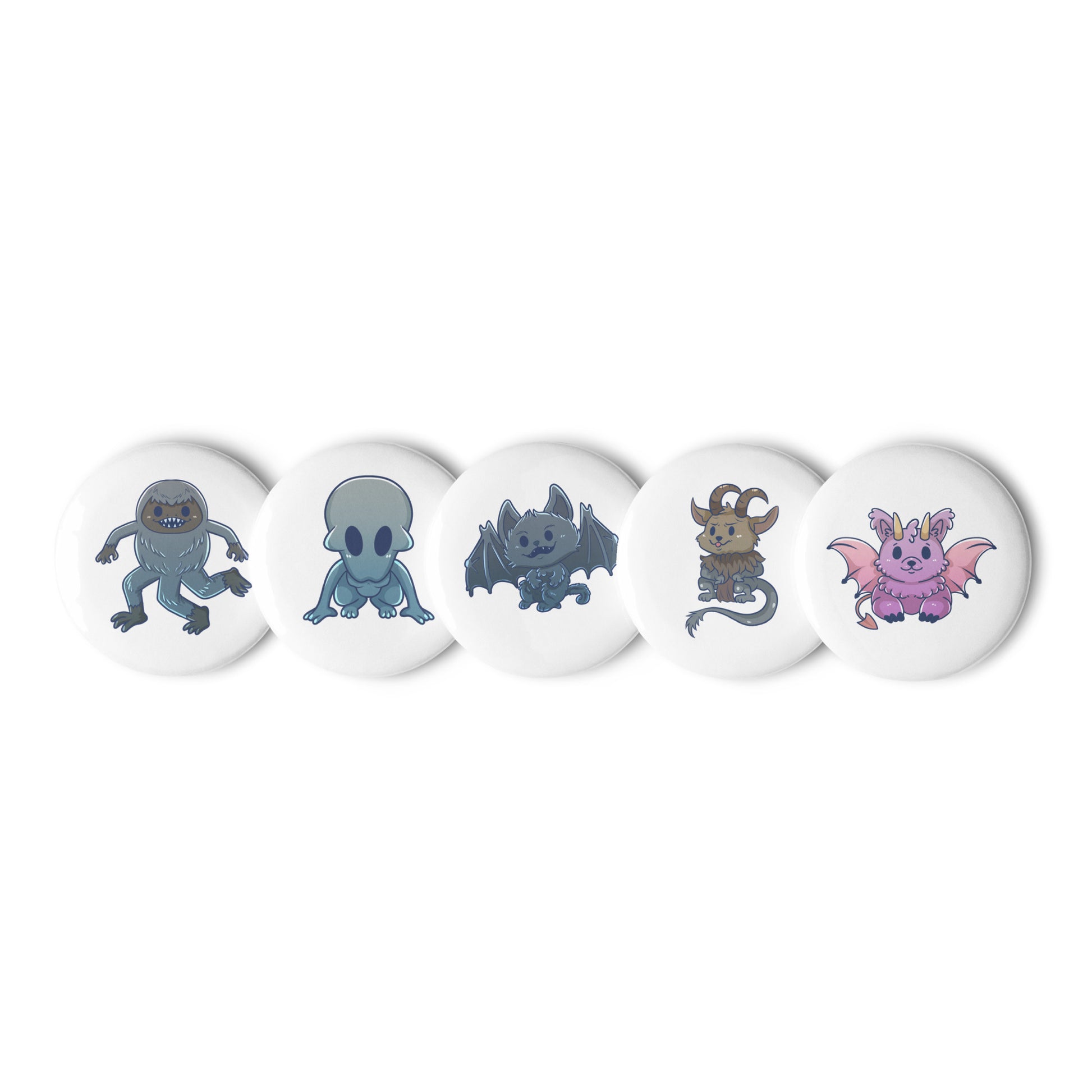 5 Count Set of Pin Buttons featuring Adorable Cryptids